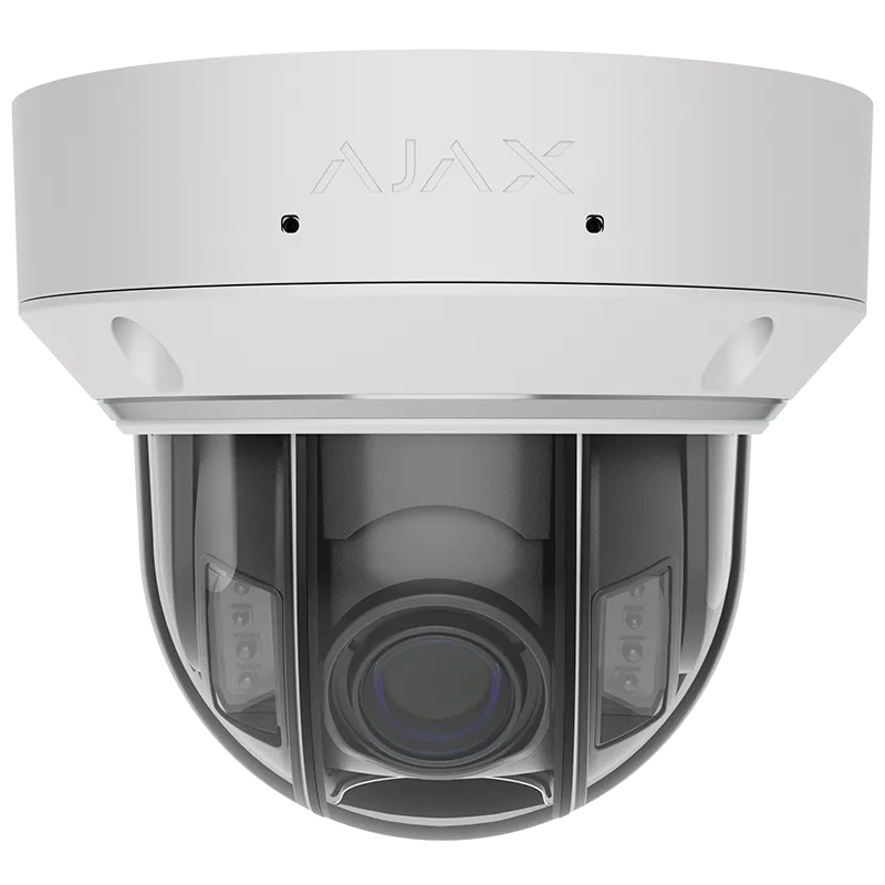 Ajax DomeCam HLVF är en trådbunden IP-kamera med varifokal (motoriserad) lins, hybridbelysning, AI, inbyggd mikrofon samt ljud- och larmingångar/-utgångar.
