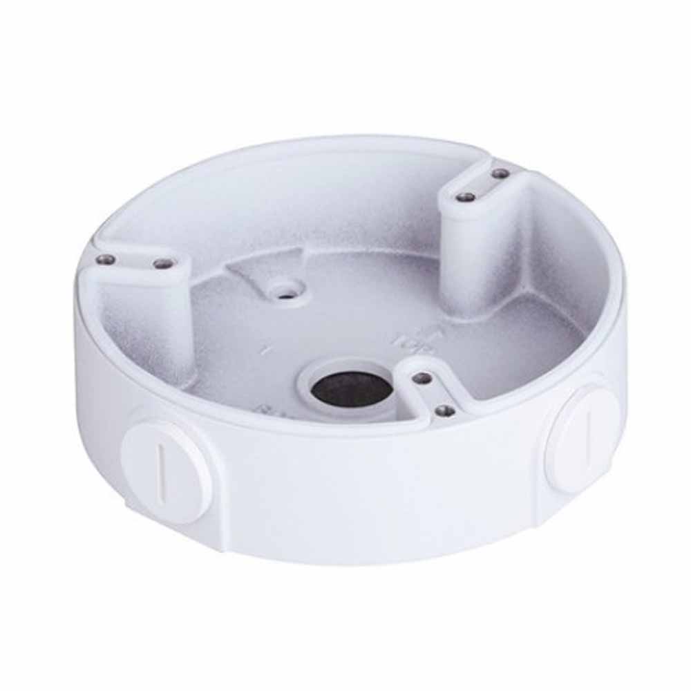 Tak och väggfäste/kopplingsbox för Dahua dome-kameror. Väggfästet är i stabilt vitlackerad metall och döljer kabelkopplingar inne i fästet.